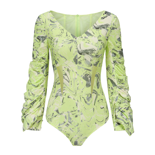 NEOR GREEN PRINTED SWIMSUIT WITH GATHERED. SLEEVES