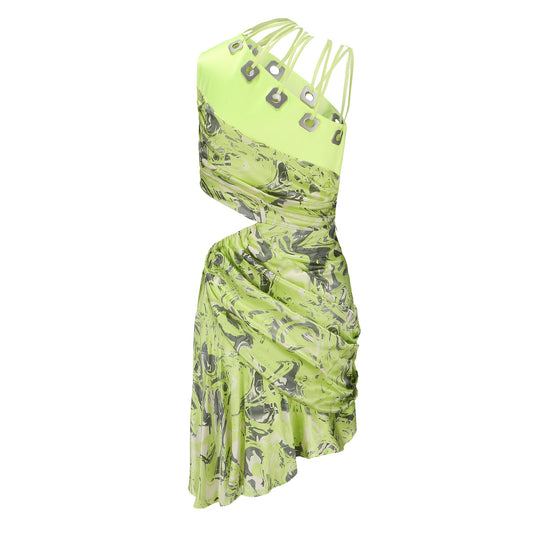 NEON GREEN PRINTED HALTERNECK DRAPED DRESS WITH CUT-OUTS