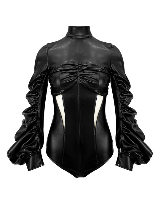 GATHERED FAUX LEATHER BODY SUIT